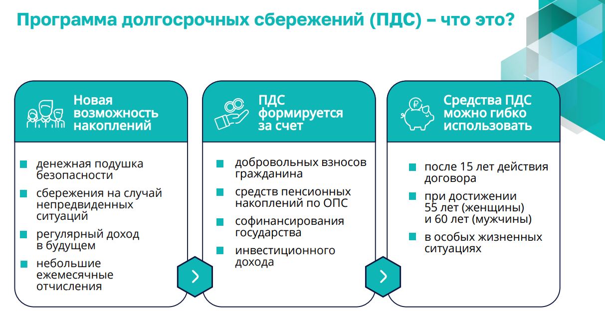 Программа долгосрочных сбережений (ПДС) помогает накопить финансовую подушку или получить прибавку к пенсии.