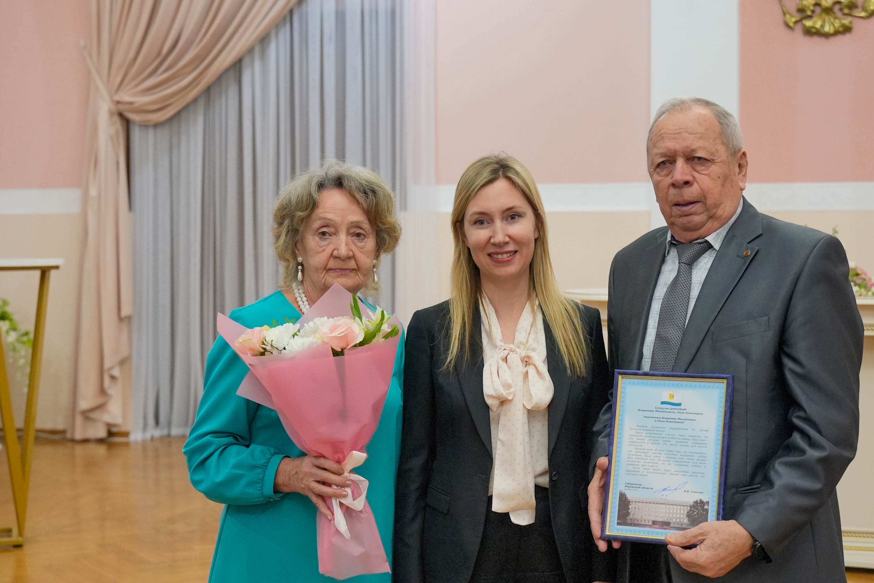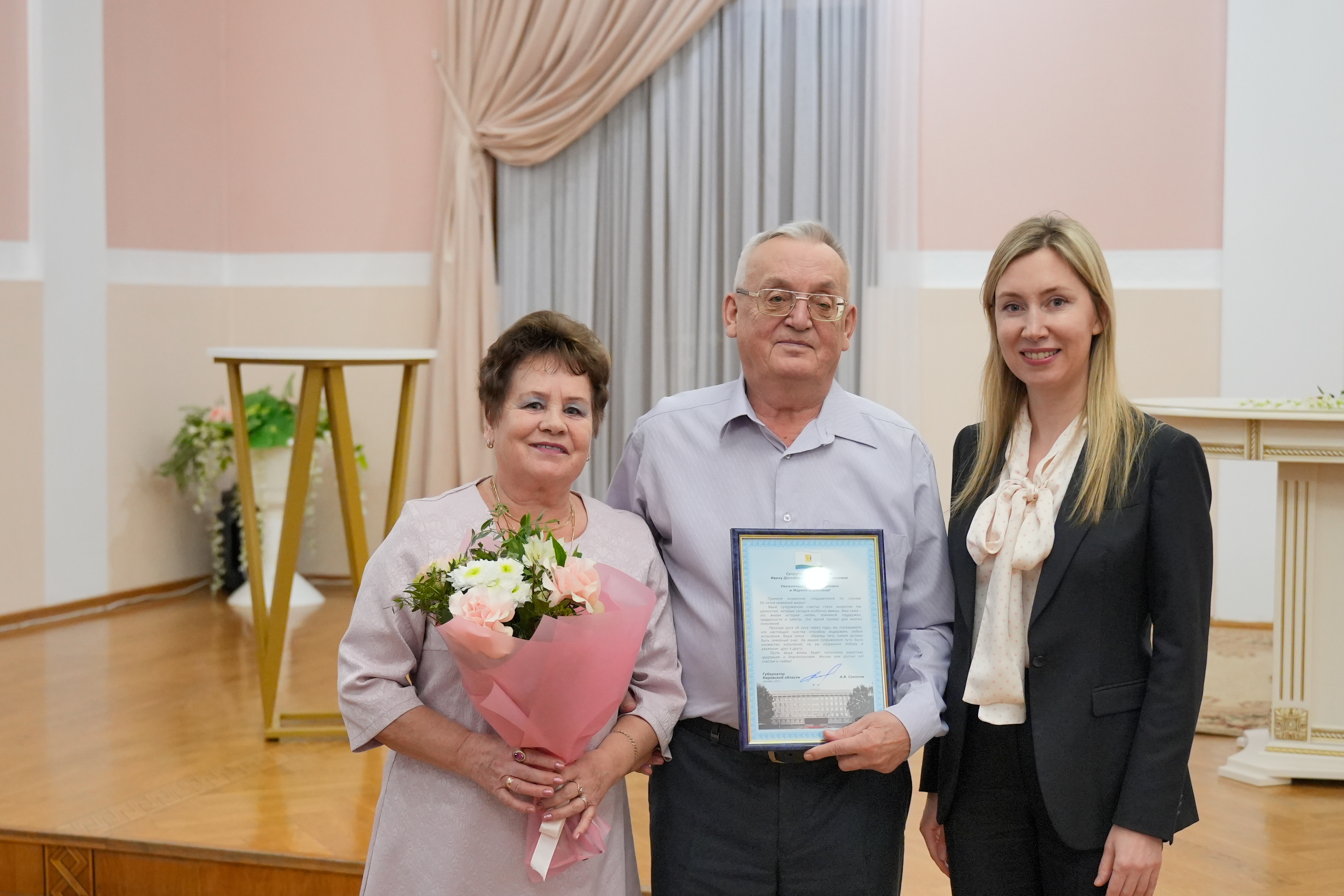 С приветственным словом к гостям обратился губернатор Кировской области Александр Соколов: «На таких церемониях ясно видишь: настоящее счастье рождается в семье. Это наши корни, наша поддержка, наш главный тыл. У каждой из пар своя история любви. И свой, проверенный десятилетиями секрет семейного счастья. Секрет, который делает наш регион и всю страну крепче. Пусть на вятской земле будет еще больше семей, где рождаются дети и множится счастье».