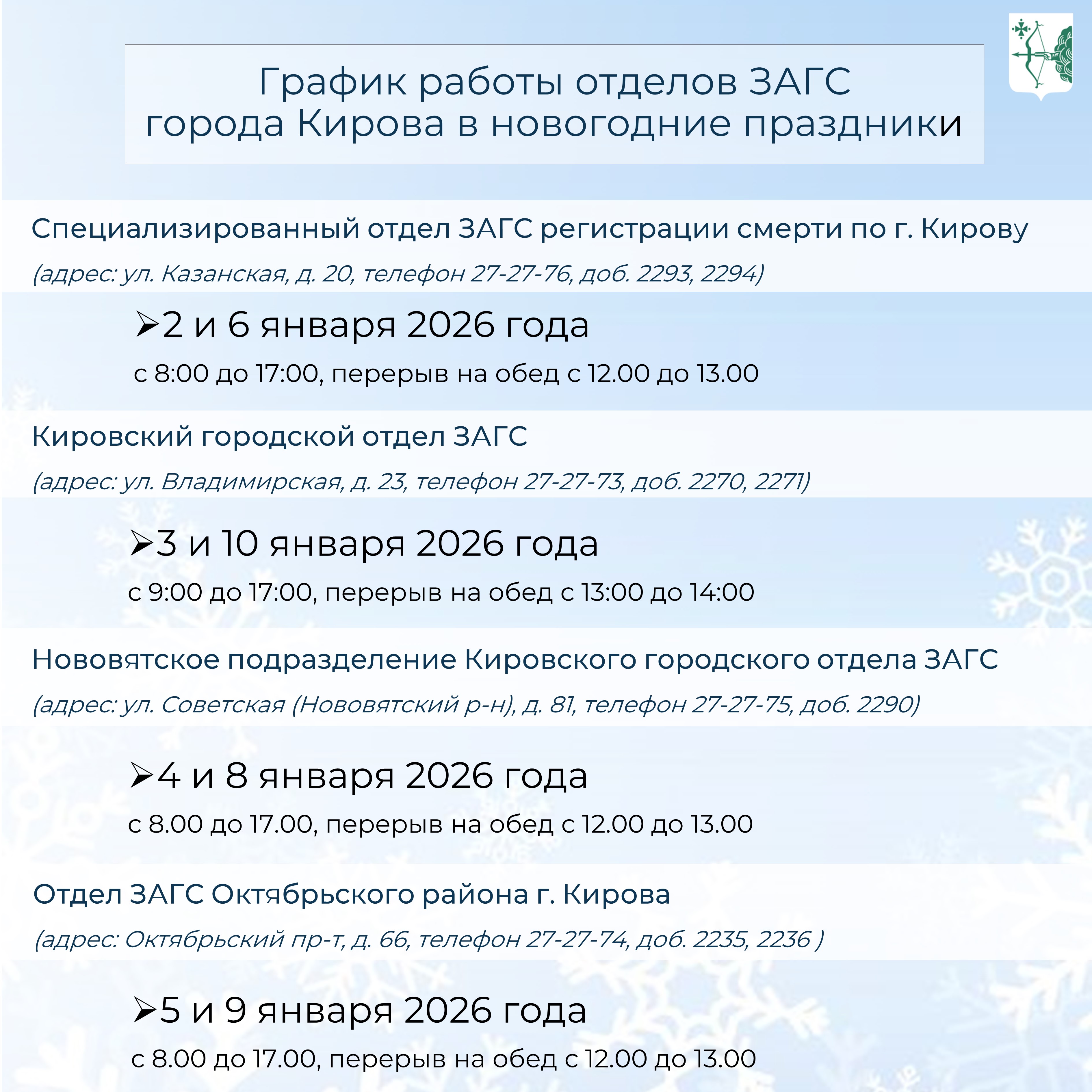 В период новогодних праздников территориальные отделы и подразделения ЗАГС города Кирова и Кировской области будут вести прием граждан в соответствии с утвержденным графиком